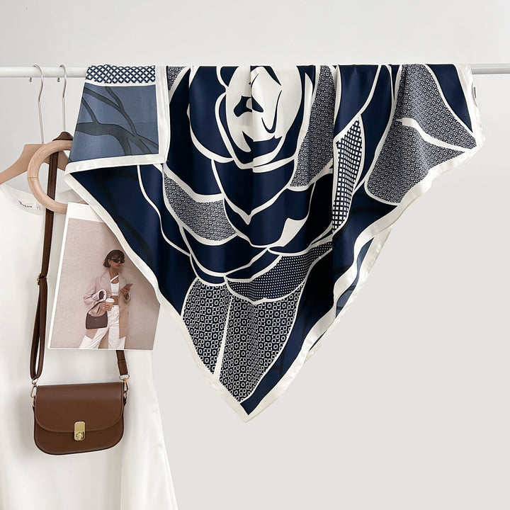Featuring delicate floral motifs, this scarf embodies a timeless charm that never goes out of style. The carefully chosen colors—Dark Blue Rose, Green Rose, Dark Brown Rose, and Black Rose—offer refined sophistication, allowing you to pair the scarf with a wide range of wardrobe choices. Its square design (90 x 90 cm) ensures maximum versatility, whether styled around your neck, draped over your shoulders, tied to a handbag, or used as a chic headscarf.